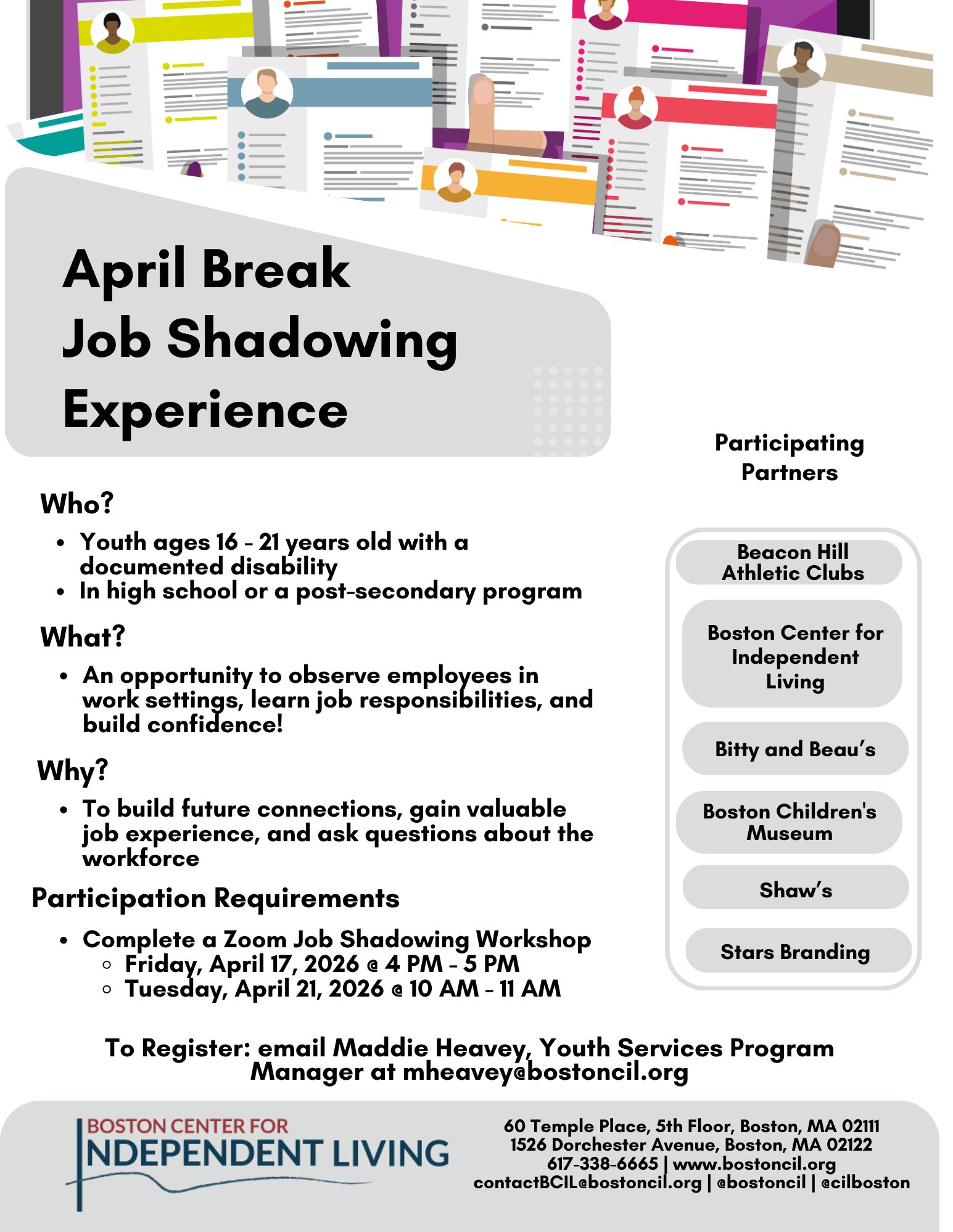 Eligibility: High School and Post secondary students 14-21 with disability documentation. Please email documentation to Maddie Heavey at mheavey@bostoncil.org.